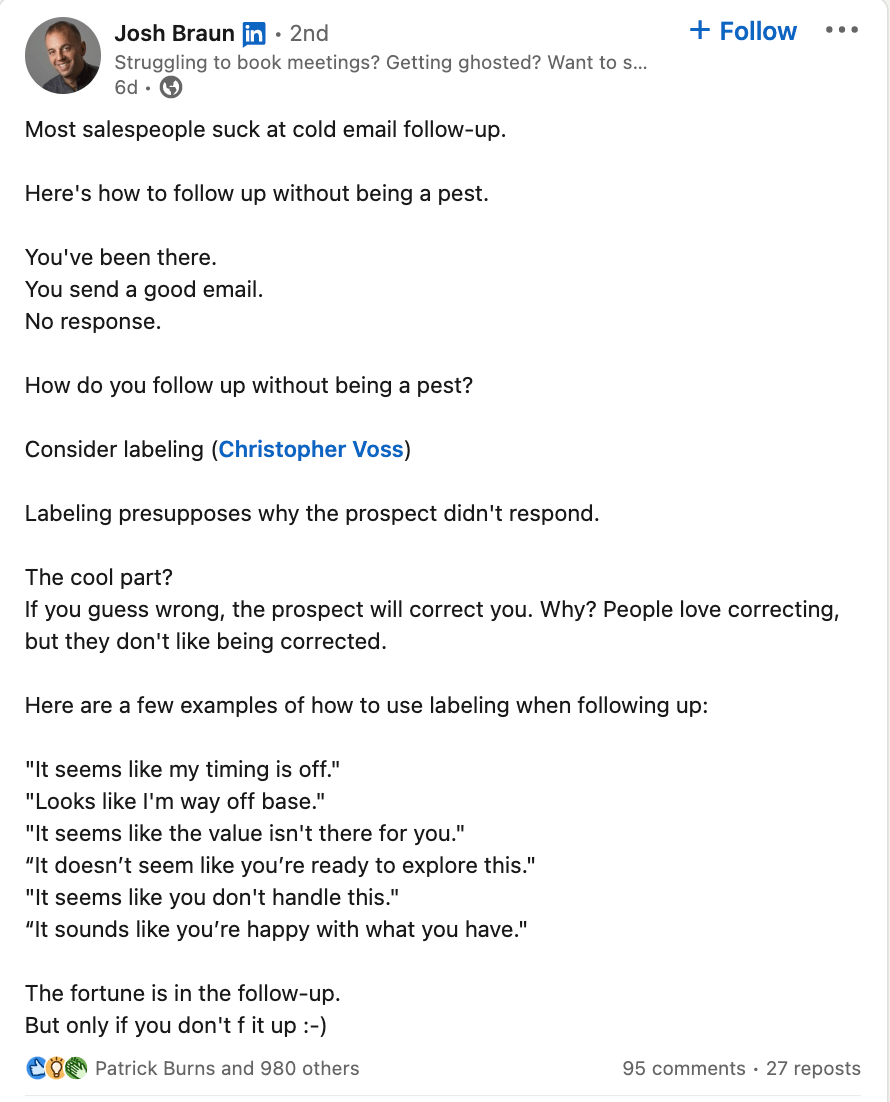 Opening a cold call with “Did I catch you at a bad time?” drops your chances of booking a meeting by 40%.