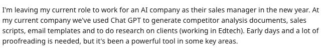 AI uses in sales: Sales reps are actively using AI to write templates, do research, and automate note taking and follow ups. But you’ll still need to proofread.