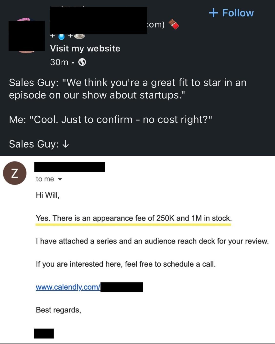 A podcast appearance for the low price of $250K and $1M in stock. 😅