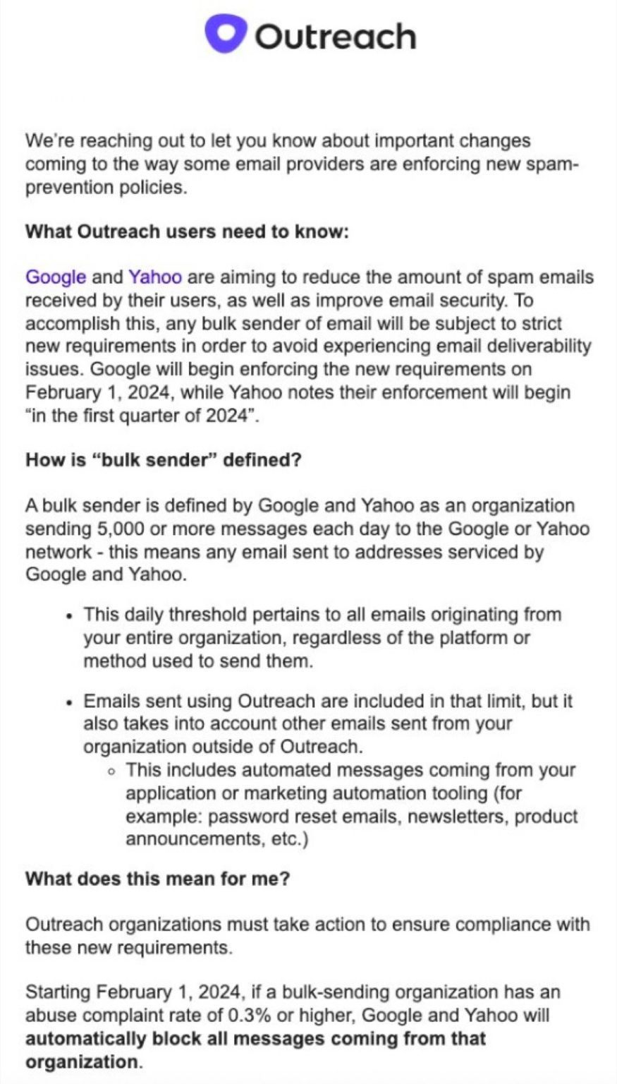 Earlier this week, Outreach.io, the email outreach platform, sent an email to their customers that has the sales world buzzing. The message includes new changes in email rules from Gmail and Yahoo, and how it will affect businesses sending mass email campaigns.