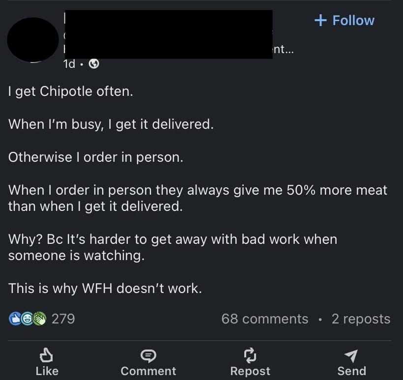 Chipotle delivery = WFH employees. Do you agree? 🤔